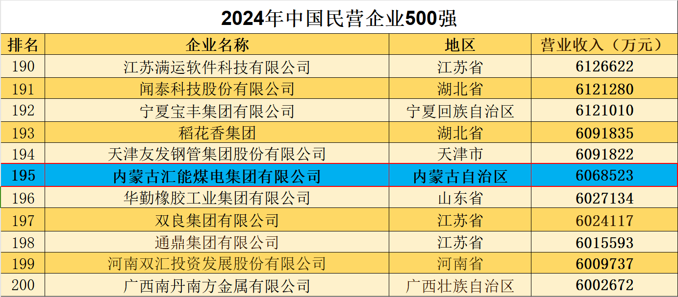 10 月 12 日,全國工商聯(lián)發(fā)布 2024 中國民營企業(yè) 500 強報告并公布榜單。匯能控股集團有限公司(原內(nèi)蒙古匯能煤電集團有限公司)位列榜單195位,較2023年的240位前進44位。